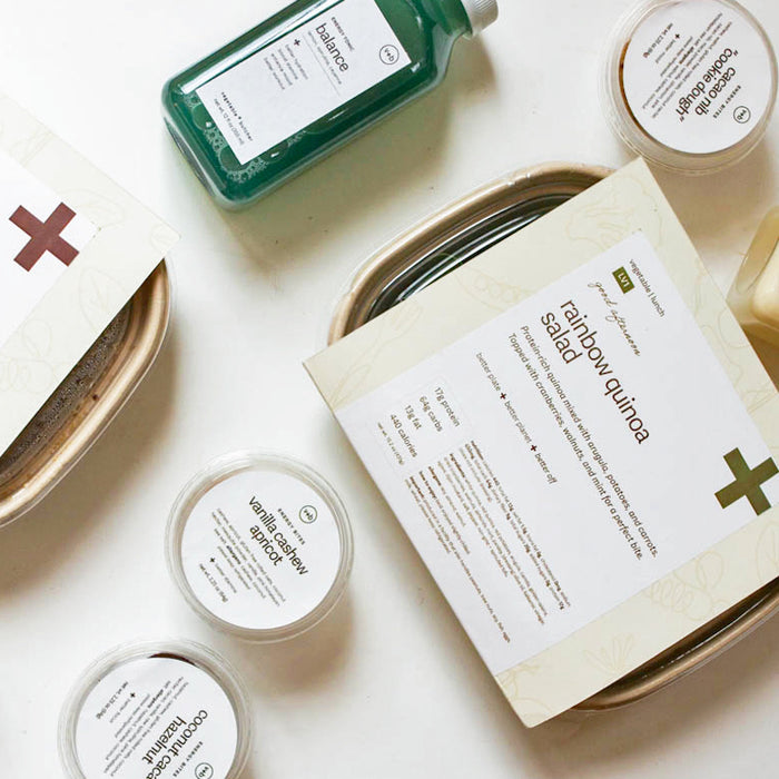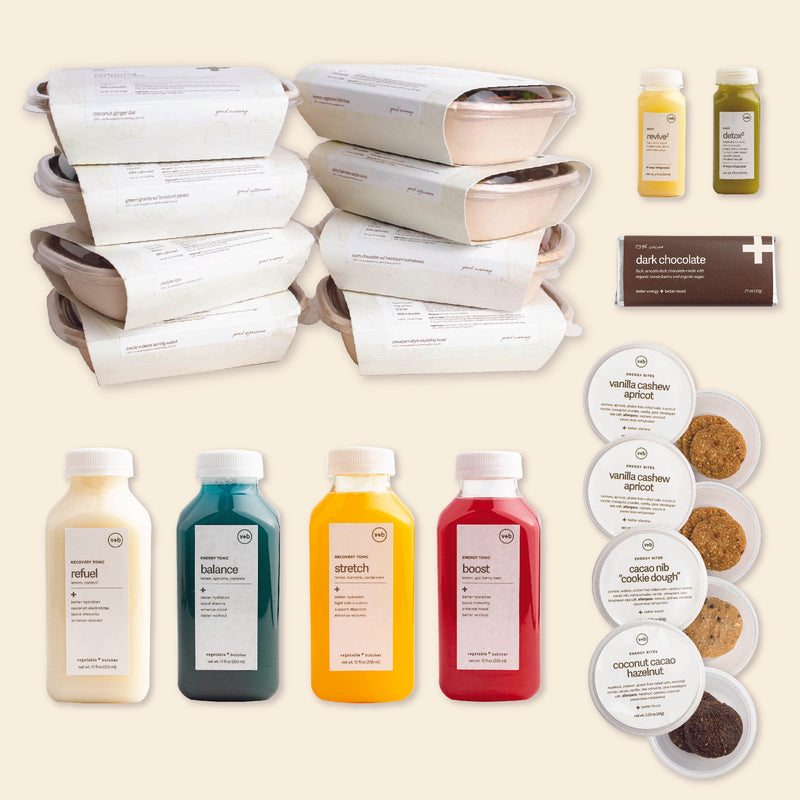 Eat a smart breakfast (not included); we recommend oatmeal or hard-boiled eggs. The program includes 4 days of lunch and dinner, as well as a pack of energy bites to beat the 3pm slump and an organic alkaline-water based tonic for pre- or post-workout energy. You'll also get to sample our wellness shots—a great supplement to breakfast to get your digestive tract moving—and one locally made dark chocolate bar for an antioxidant-rich dessert.