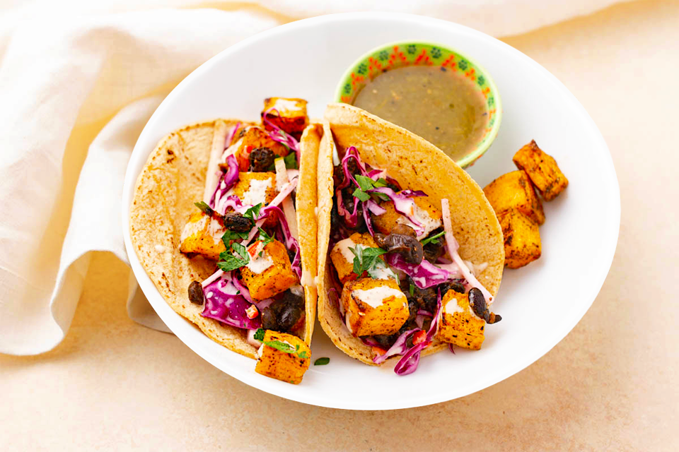 Butternut Squash Tacos w/ Smoky Black Beans + Jicama Slaw (Vegan)