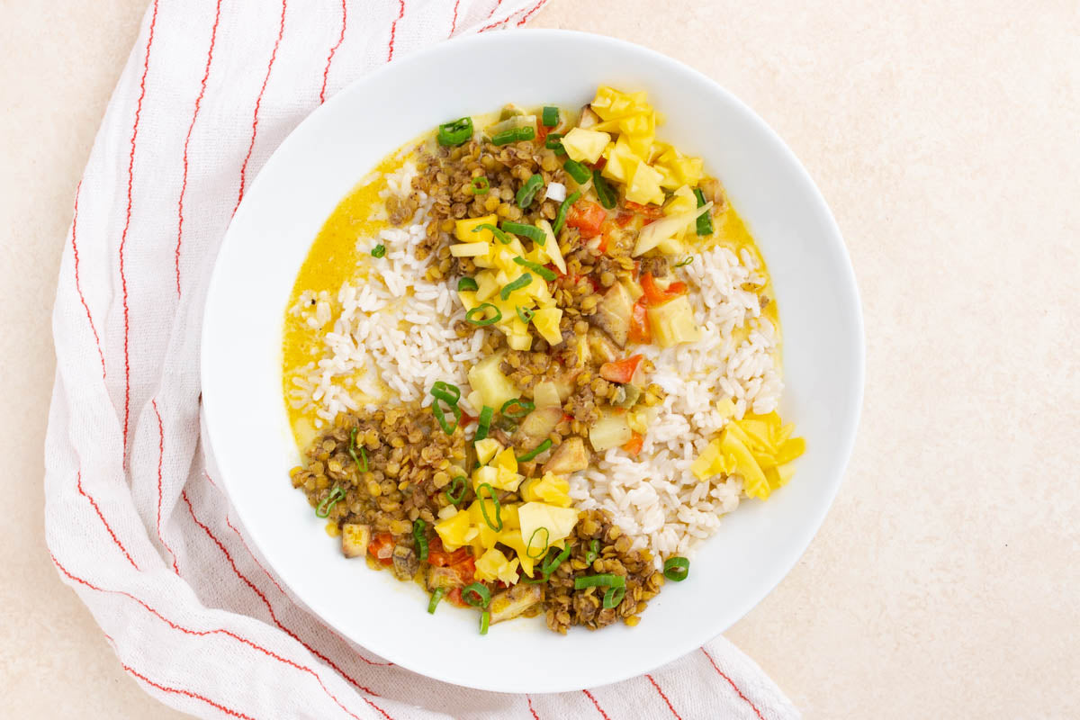 Jamaican Curry w/ Coconut Rice + Jerk Spiced Lentils with Jerk Chicken Thighs