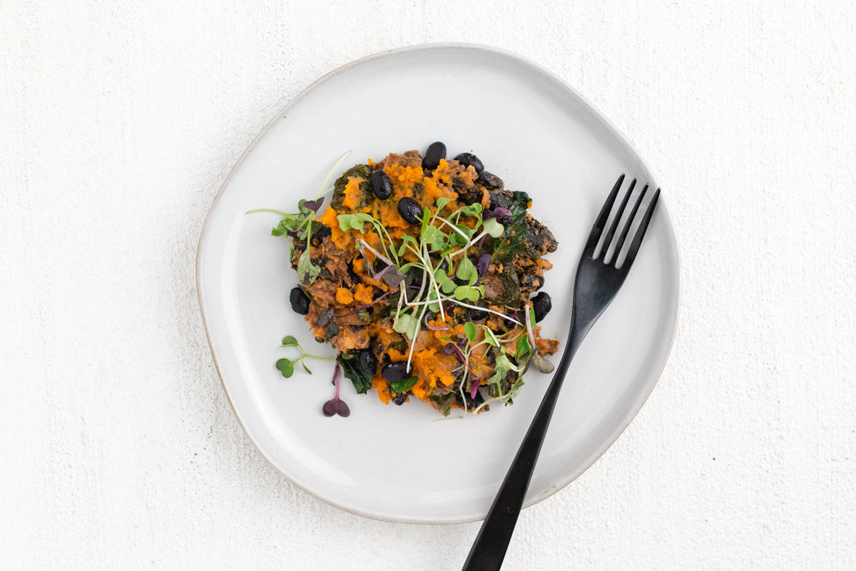 Sweet potatoes are a great source of vitamins A, C, and B6. They’re also rich in manganese and potassium. We’ve paired them with spiced black beans that provide extra protein and iron.