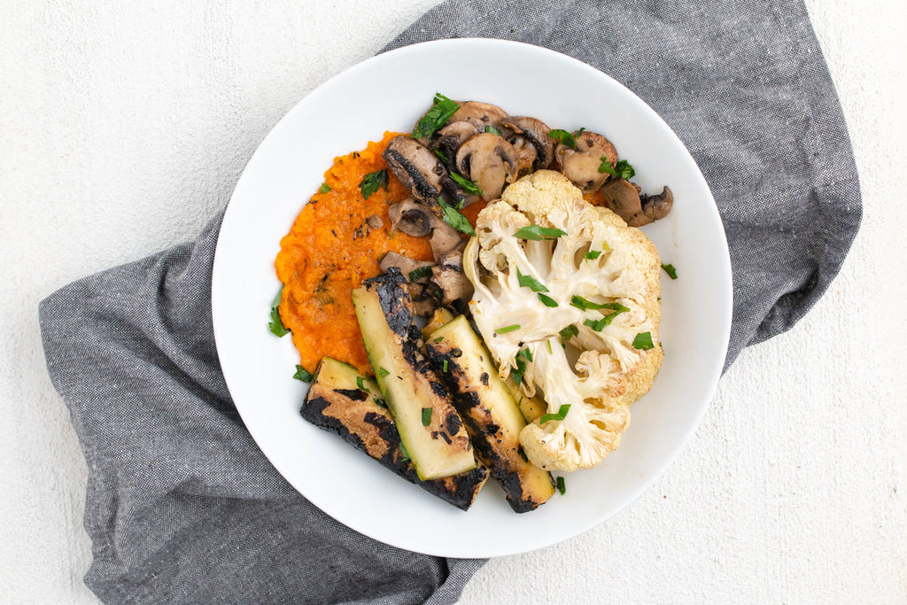 Roasted Cauliflower Steaks w/ Roasted Zucchini + Chimichurri with Garlic + Herb Roasted Pork Loin